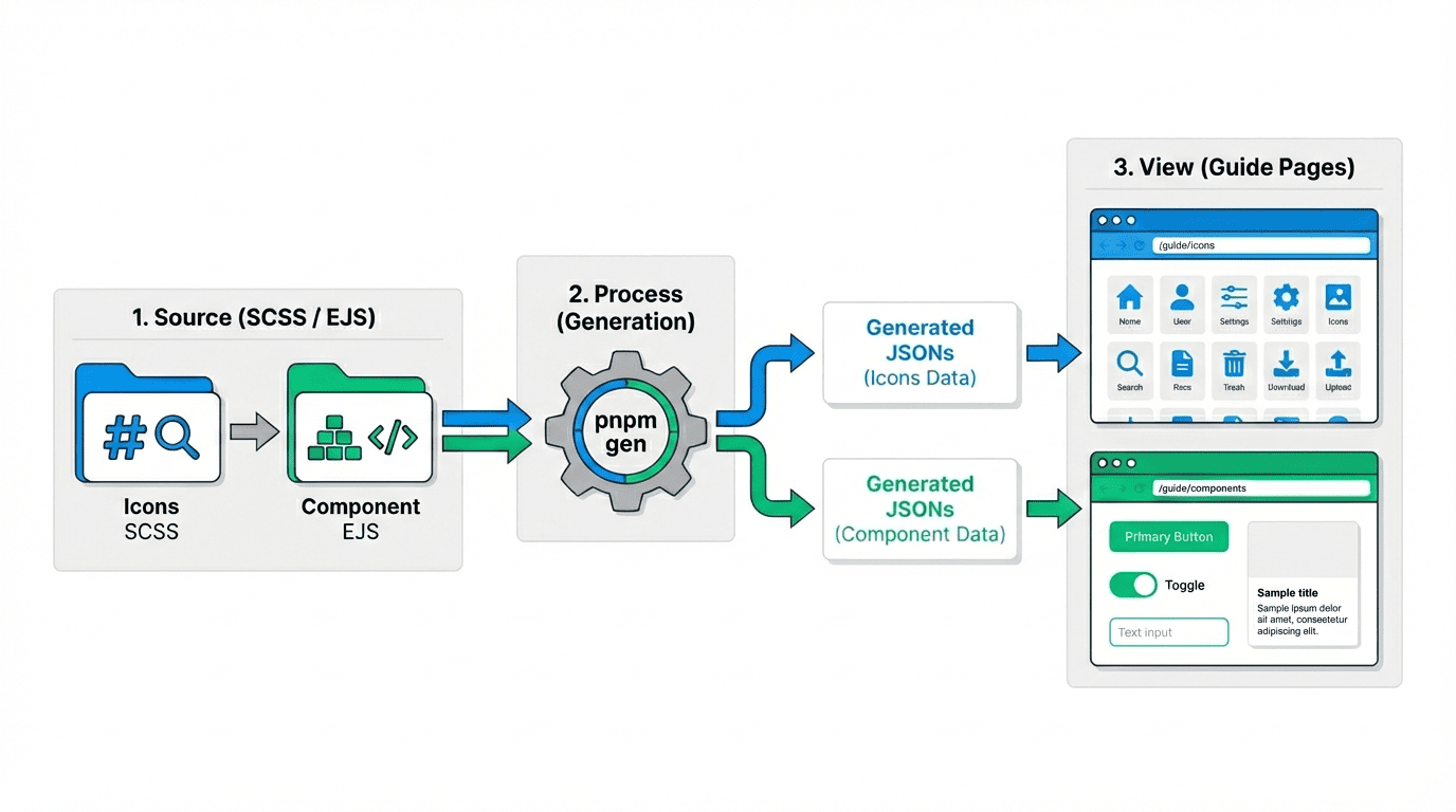 아이콘과 컴포넌트 각각에 대해 **“단일 소스(Source of Truth)를 정하고, 자동 생성된 결과물을 가이드 페이지에서 확인한다”**는 공통된 운영 패턴을 적용하는 것입니다.
