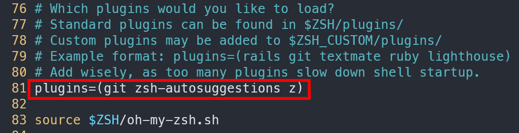 1. ~/.zshrc 파일을 편집하여 플러그인을 활성화하세요. plugins=() 텍스트 내 소괄호에 'zsh-z'를 추가합니다. zsh-autosuggestions와 함께 사용하고 싶다면 다음과 같이 작성할 수 있습니다: